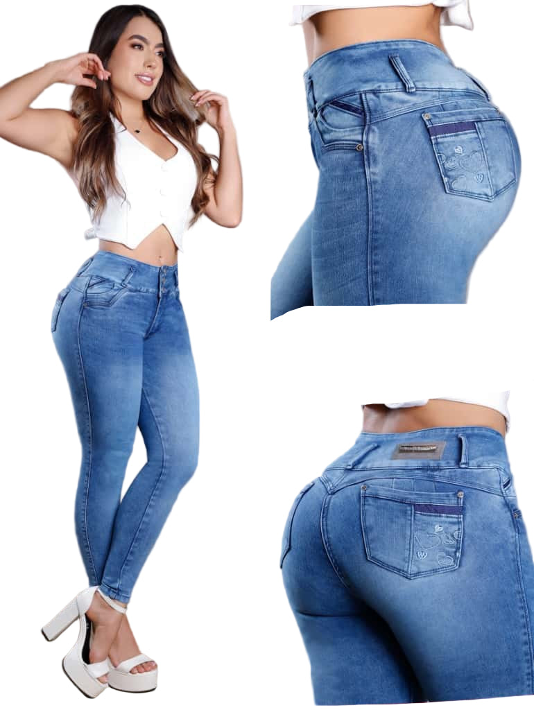 100% COLOMBIAN JEANS, High waist to define it more, its internal design is heart-shaped giving the round shape and enhancing/giving it a lift with natural volume.